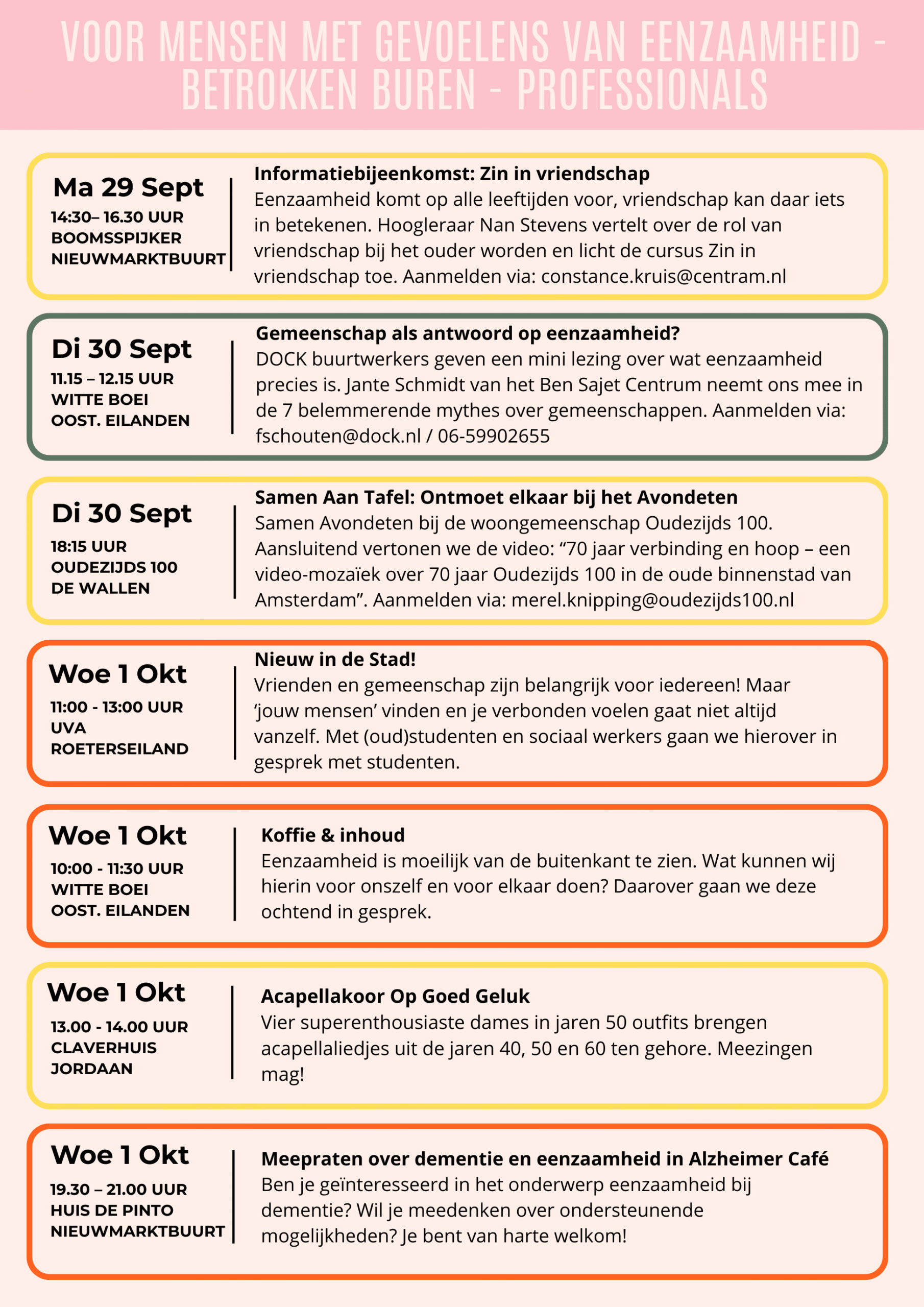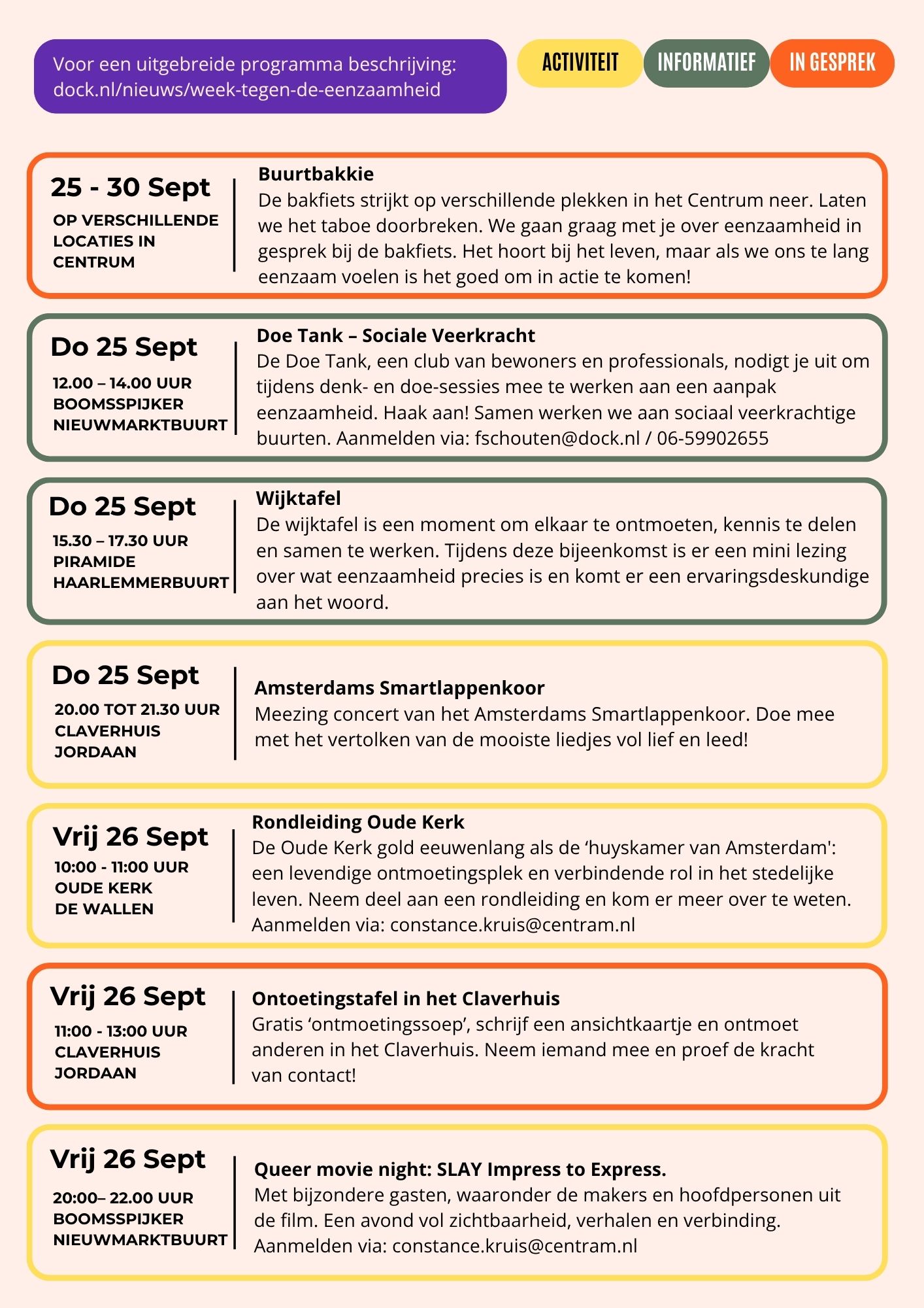 Iedereen kan meedoen aan de Week tegen Eenzaamheid. Bijvoorbeeld door iets te doen met iemand in je omgeving, maar je kunt ook een activiteit bezoeken of organiseren. Kijk op dock.nl voor de verschillende activiteiten.
